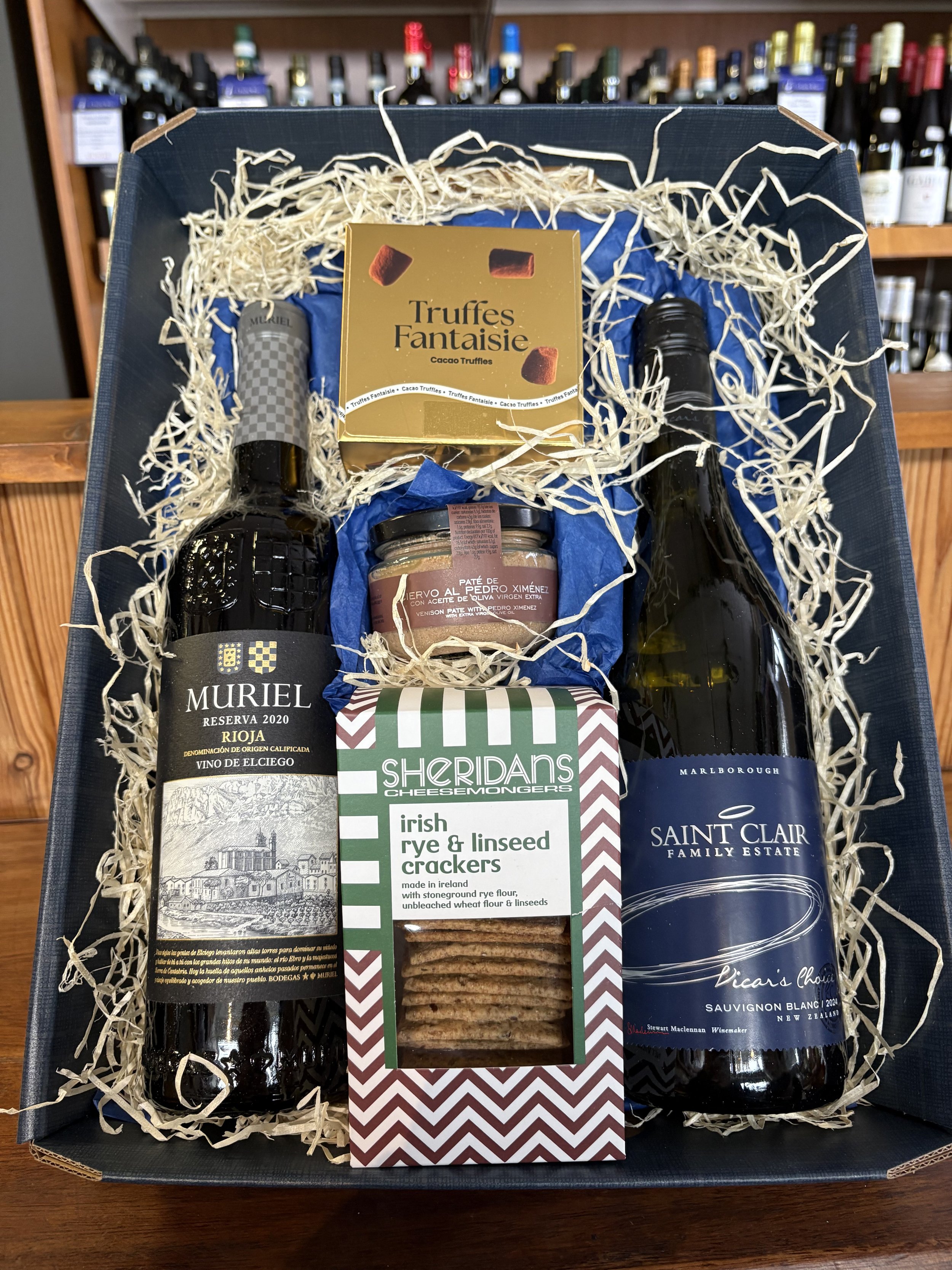 A vibrant mix of flavours begins with the crisp lift of La Vicomte Sauvignon Blanc, the deep, rounded character of La Vicomte Cabernet Sauvignon, and the refreshing sparkle of Prosecco. The hamper also features the handcrafted charm of Irish Craft Co. soda, the bold crunch of Quillo crisps, and the smooth sweetness of Skellig chocolate. A bright pesto chutney adds a savoury twist, bringing playful textures and lively flavours together for a wonderfully eclectic gourmet experience